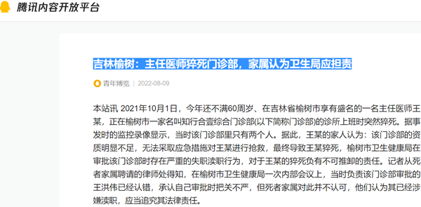 本站讯 2021年10月1日,今年还不满60周岁、在吉林省榆树市享有盛名的一名主任医师王某,正在榆树市一家名叫知行合壹综合门诊部(以下简称门诊部)的诊所上班时突然猝死。据事发时的监控录像显示,当时该门诊部里只有两个人。据此,王某的家人认为:该门诊部的资质明显不足,无法采取应急措施对王某进行抢救,最终导致王某猝死,榆树市卫生健康局在审批该门诊部时存在严重的失职渎职行为,对于王某的猝死负有不可推卸的责任。记者从死者家属聘请的律师处得知,在榆树市卫生健康局一次内部会议上,当时负责该门诊部审批的王洪伟已经认错,承认自己审批时把关不严,但死者家属对此并不认可,他们认为其已经涉嫌渎职,应当追究其法律责任。
