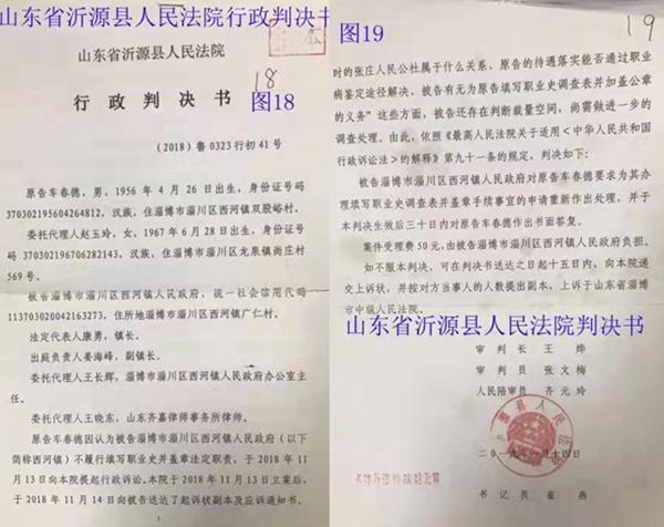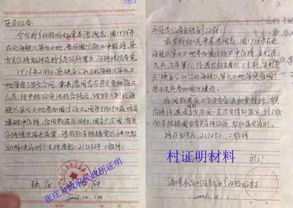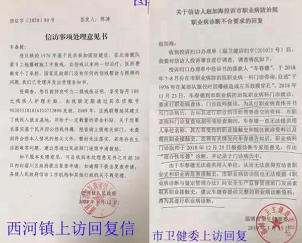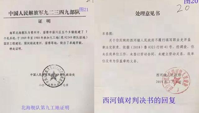 事情回顾:1976年初,原张庄人民公社(现西河镇政府)与北海舰队第九工地签订了劳务合同,车春德与120余名基干民兵经过严格政审和体检,由公社干部陈先富(现仍健在)带队,到北海舰队第九工地4812工程(现中国人民解放军92349部队)参加国防建设,同年9月29日在坑道爆破施工中致残。此次重伤给他留下了严重的脑震荡后遗症,如心悸失眠、耳膜穿孔、耳聋耳鸣、左眼眼角膜脱落、左腿膝盖处被击穿、行走靠拄双拐、左肺基本上失去功能(萎缩钙化了)等,现在左胸部仍有石块未取出。1980年合同期满施工任务圆满完成后,施工队伍返回。北海舰队第九工地王团长与张庄人民公社武装部部长刘加顺,将包括车春德在内的重伤残基干民兵进行了交接,双方商定:“重伤残民兵回到地方后,由当地人民政府负责安排工作,给与社会救济,保证伤残人员的正常工作和生活”。可几十年来,车春德一直没有得到任何伤残待遇,始终是自己养伤治病,天天求医问药,生活非常困难却无人问津。他万般无奈,只能去淄博市职业病医院鉴定职业病,在2018年已经确认为职业病时(有市职业病医院病例为证),需要现西河镇政府作为用人单位,为其填写职业病史调查表和加盖公章,以便按照职业病落实待遇。可时至今日,西河镇政府始终不予填写和加盖公章。