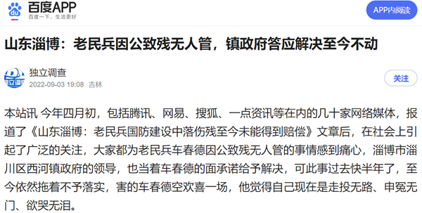 本站讯 今年四月初,包括腾讯、网易、搜狐、一点资讯等在内的几十家网络媒体,报道了《山东淄博:老民兵国防建设中落伤残至今未能得到赔偿》文章后,在社会上引起了广泛的关注,大家都为老民兵车春德因公致残无人管的事情感到痛心,淄博市淄川区西河镇政府的领导,也当着车春德的面承诺给予解决,可此事过去快半年了,至今依然拖着不予落实,害的车春德空欢喜一场,他觉得自己现在是走投无路、申冤无门、欲哭无泪。