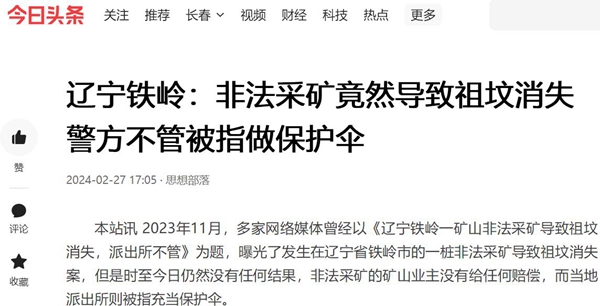 本站讯 2023年11月,多家网络媒体曾经以《辽宁铁岭一矿山非法采矿导致祖坟消失,派出所不管》为题,曝光了发生在辽宁省铁岭市的一桩非法采矿导致祖坟消失案,但是时至今日仍然没有任何结果,非法采矿的矿山业主没有给任何赔偿,而当地派出所则被指充当保护伞。