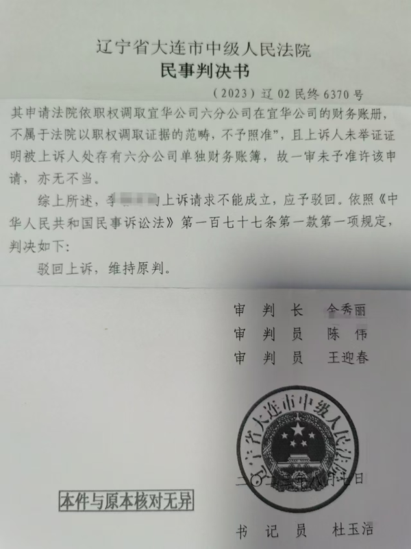 李先生说,这次甘井子区法院的判决,全以一句“驳回原告全部诉讼请求”而判定此事,他不服,又上诉到大连市中级法院。这一次李先生申请法院调取他在宜华的财务账册,宜华只要拿出财务账册,所有的款项都清楚了,可是法院说“不属于法院依职权调取证据的范畴,不予照准”,大连中院同样用一句“驳回上诉维持原判”来了结这起官司。