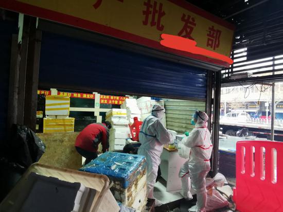 2020年1月1日,华南海鲜批发市场关闭后,相关工作人员正在采样检验。 本报记者 张家振 摄