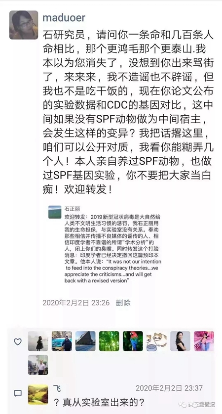 2月2日,石正丽怒了,她在朋友圈发表声明:2019新型冠状病毒是大自然给人类的不文明生活习惯的惩罚,我石正丽用我的生命担保,与实验室没有关系。奉劝那些相信并传播不良媒体的谣传的人、相信印度学者不靠谱的所谓“学术分析”的人,闭上你们的臭嘴。同时转发这个打脸的消息:印度学者已经决定撤回这篇预印本文章。