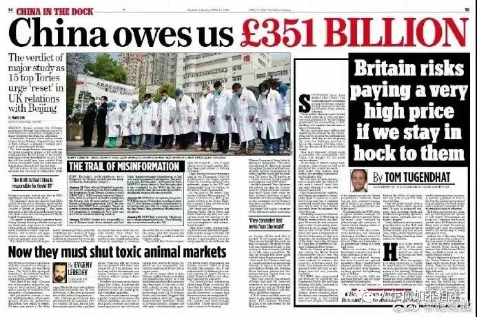 3、该报还报道了一份英国智库亨利·杰克逊学会的报告:全球大流行给七国集团(G7)造成约3.2万亿英镑的巨大损失,而“此前试图隐瞒疫情信息”的中国本可以减轻新冠病毒在全球范围内的经济影响。