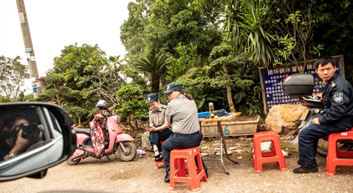 村委会主任也不知道哪里来的保安在“跨界违规执勤”。
