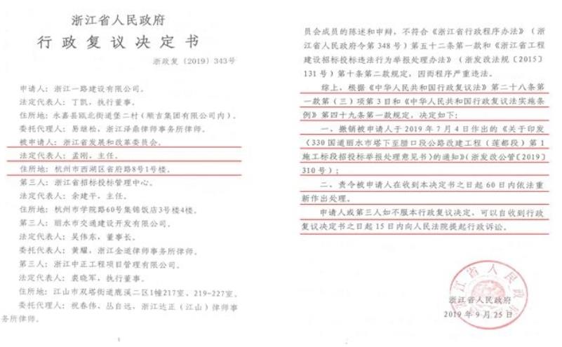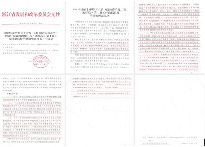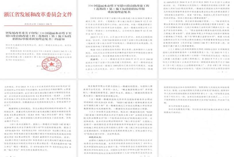 2020年6月9日,浙江省发改委(浙发改公管{2020} 198 号)文件,关于印发《330国道丽水市塔下至腊口段公路改建工程(莲都段)第1施工标段招投标举报重新处理意见书》的通知,责令评标委员会改正。这一重新作出的处理意见仍然执意废掉一路公司的中标资格。