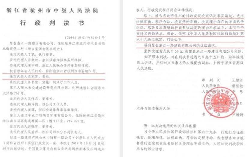 2020年3月20日,杭州市中级人民法院作出行政判决书认可了省政府行政复议决定书撤销省发改委处理意见的结论,同时在本院认为部分纠正和否定了省发改委认为一路公司业绩无效的认定。
