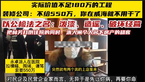 威海瑾玺事件,揭露出了一段黑装修联合高利贷及村痞恶霸的地方势力,以软暴力为主要手段,对企业进行长时间、持续不间断的“围剿”,将民企闹倒后,通过其背后的“保护伞”在威海公检法内部组成的利益集团来拍卖企业资产来超额获利。