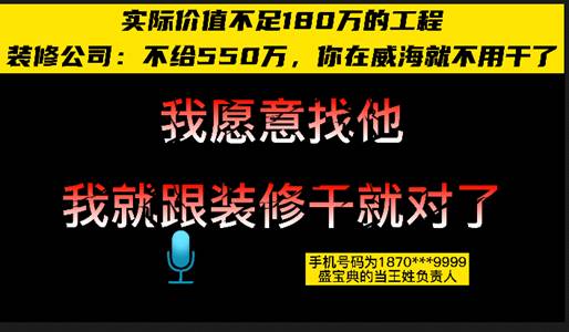 如果到这里,这只是一起因借贷引起的暴力讨债的纠纷;然而,事情的走向从2017年11月的另外一个节点开始恶化——在得知瑾玺银行贷款放款后,给瑾玺位于威海市临港区装修的永卓公司在收到分批付款后,在合同期内、施工未完成的状态下开始以涉嫌黑社会的违法犯罪手段讹要高于市场正常价值3倍的工程款。