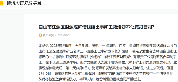 本站讯 2023年3月8日,今日头条、腾讯、一点资讯、百度、焦点日报等诸多网络媒体以《白山市江源区财源煤矿五名矿工下班路上出事矿方不管》为题,曝光了发生在吉林省白山市江源区的一桩惨剧:江源区财源煤矿(全称“白山市江源区财源煤业有限责任公司”)五名合同制矿工,在下班路上遭遇车祸,但矿方始终认为属于交通事故,对于矿工们的遭遇置之不理。此事经媒体曝光后,第二天(3月9日),财源煤矿就给高宝绪的家人打电话,让过去取钱。但是,3月10日,高宝绪的家人到矿上取钱时,却在矿方的逼迫下不得不无奈的签下一个借款合同,从此将被迫放弃诉讼权力。律师认为,这份所谓的借款合同严重违法。