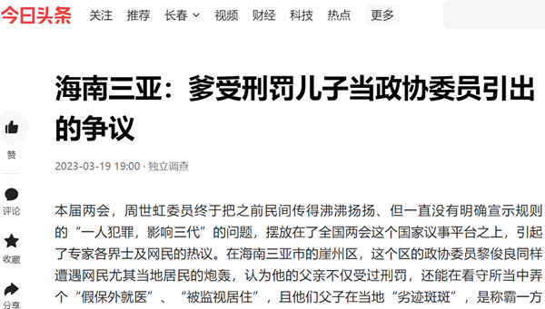 关于今年两会周世虹委员的这个提案,其主要是指“一人犯罪,影响三代”的问题,他的这个提案,主要针对不该影响“考公”,而未及其它,即使这样,也引起了轩然大波,有部分人赞成他的观点,但更多的人是持反对态度的。而爹受刑罚,儿子能不能当政协委员之议论,大多来自海南的三亚,或者更多的来自三亚的崖州区,反对方认为,国家的这个规定,是遏制犯罪的最有效方法,当一个人有了犯罪的愿望或动机时,想想自己的孩子们,因孩子是任何人的软肋。所以,不管是考公务员,还是参军等一些行业,一定要有这个限制,至于黎俊良政协委员这个身份,更应该参照这个规定来执行,因为政协委员是一个“政治身份”,对有这个身份人的考核,要比“考公”和参军更严格才对。“上梁不正下梁歪”的古训是有绝对道理的。