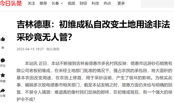 据了解,对于初维成的问题,曾有多家媒体进行曝光。从以往的媒体报道看,当地政府和有关部门对此事十分敏感,也算比较“重视”,可是一年后,为什么村民们还在反映此事?为核实村民们反映问题是否属实,2023年4月13日到14日,本站编辑曾多次致电德惠市自然资源局(原名国土资源局)、水利局、松花江镇土地管理所、水利局下属的砂石管理所。4月13日,土地局一位李姓工作人员在接到媒体核实情况的电话后,认真的记下了需要核实的问题,即:初维成是否占用了村民承包的土地修路?如果他占用了村民承包地修路,是否有批准手续?李姓工作人员认真的记下需要核实的问题后称,会向领导汇报,再与几个部门联系后再回复媒体,但当4月14日媒体再次打电话问询时,该人却称媒体如果想核实此事,需要走正规途径。编辑称,只是问询这么点小事,还用我们千里迢迢的赶到德惠吗?但对方称,必须走正规途径!电话里说不方便。