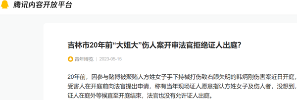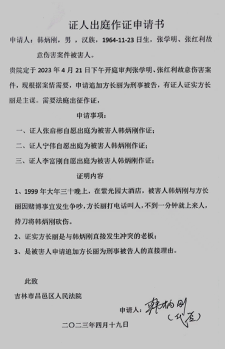 2023年4月19日,韩炳刚再一次向法院递交申请书,申请当年在赌博现场目睹他被致伤整个过程的三个证人出庭。