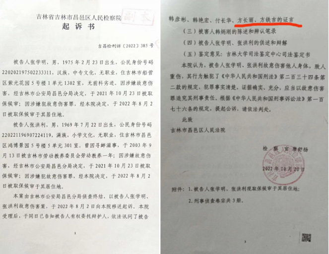 2022年 10月20日,吉林市昌邑区人民检察院向昌邑区人民法院作出吉昌检刑诉【2022】385号起诉书,起诉书称:“本院认为,被告人张学明、张洪利故意伤害他人身体,致人重伤,其行为触犯了《中华人民共和国刑事诉讼法》第二百三十四条第二款的规定,犯罪事实清楚,证据确凿、充分,应当以故意伤害罪追究其刑事责任。”