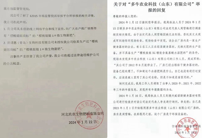 2、樱桃姐姐5G增效含氨基酸水溶肥料:包装上显示由殿龙公司委托山东安德施生物科技有限公司、多牛农业农业科技(山东)有限公司生产。依据宁津县生产监督管理局回复,多牛公司于2012年8月停业,公司被冒用;该公司声明没有跟殿龙公司合作,没有生产该产品。据此可以认定该产品为假冒生产。