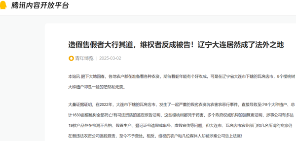 与此同时,殿龙公司却拿着大连农业农村局出具的没有盖章也没有签字的研判意见,反告多位农户以及曝光此事的媒体人。知名媒体人李广均(又名李广军)因为曝光此事,在毫不知情的情况下成了被告。瓦房店法院刻意制造缺席判决,在能联系到李的情况下,有意不通知其到庭应诉,并罔顾技术鉴定意见书等有效证据,却采信没有加盖公章、没有任何人签字承认、没有任何证明力的一张A4纸判案,3篇文章点击量仅为103个(因被殿龙公司和谐),却被判赔了殿龙公司20万元;而农户们告殿龙公司因樱桃树死亡的侵权案,拖了一年却判败诉。
