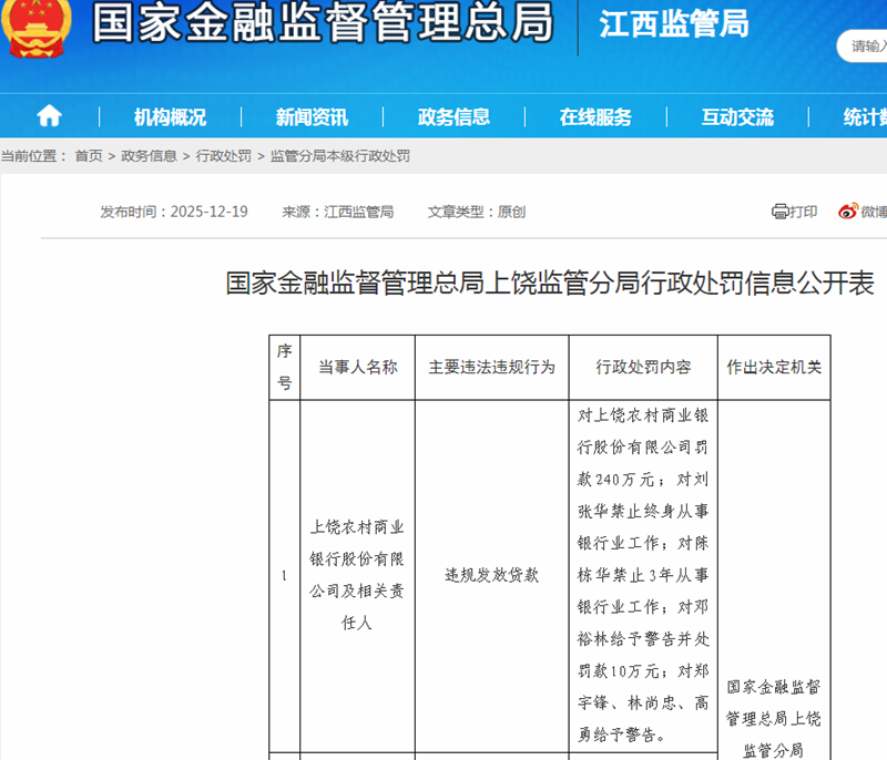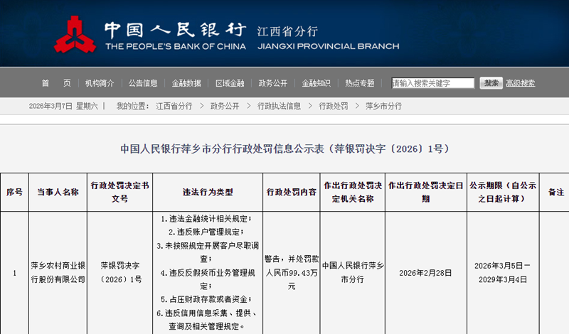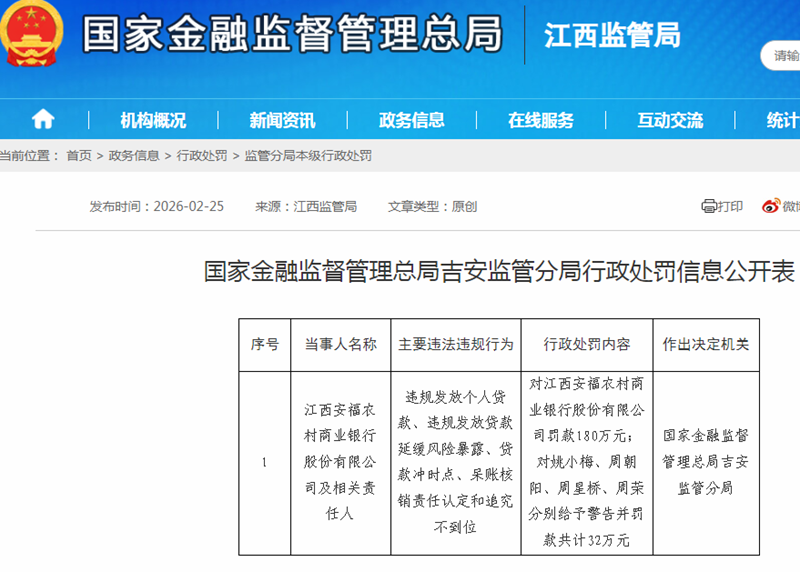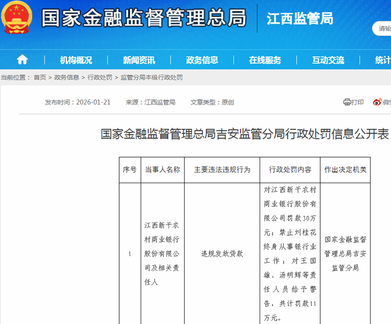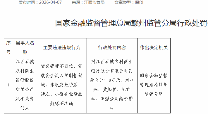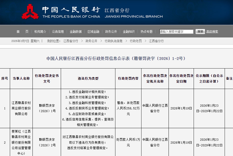 本站讯 2026 年开年不足一个季度,江西农商银行系统已沦为监管罚单 重灾区:赣昌农商银行单笔罚款 258 52 万...