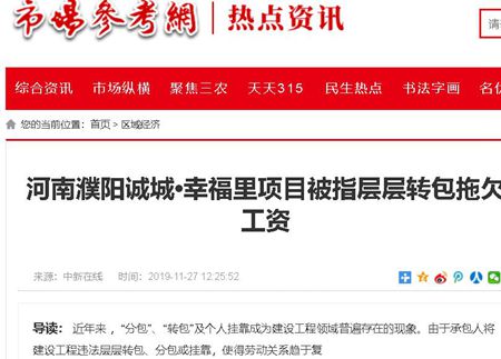近年来 ,“分包”、“转包”及个人挂靠成为建设工程领域普遍存在的现象。由于承包人将建设工程违法层层转包、分包或挂靠,使得劳动关系趋于复杂化,拖欠农民工工资的现象时有发生。“河南某公司中标河南濮阳市诚城•幸福里项目工程后,层层转包。2018年11月,我经段某明之手承包该项目商砼工程,出现拖欠农民工工资及工程款现象,虽经当地劳动部门多次督促,至今仍不予结算。”河南濮阳市诚城•幸福里在建项目商砼工程承包人、农民工代表荣令伟日前致函上级有关部门反映说。