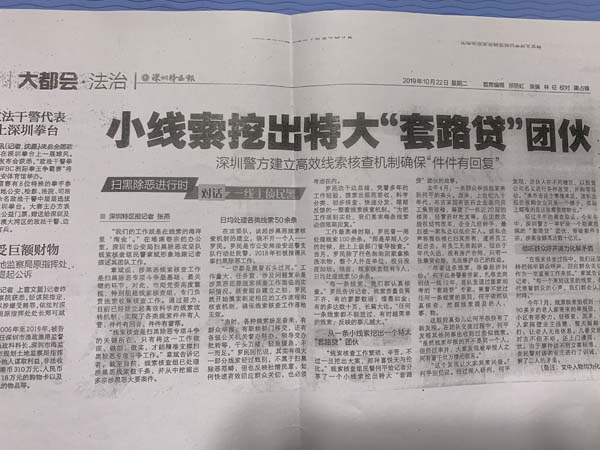 2019年10月23日,黑龙江生活报社网站转载了早些时候深圳特区报记者张燕的报道,主标题是《小线索挖出特大“套路贷”团伙》,副标题是“深圳警方建立高效线索核查机制确保件件有回复”,张记者报道的主题思想不仅宣传了公安部门办事效率,而且反映“套路贷”问题的严重性。