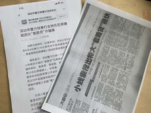2019年11月29日,消费日报网站披露了另一则消息,即《深圳警方打击钟氏犯罪嫌疑团伙“套路贷”诈骗案》,记者朱兵采访报道了深圳公安局专案组一举打击“套路贷”骨干分子钟美财、黄美菊等犯罪嫌疑人违法犯罪的新闻。