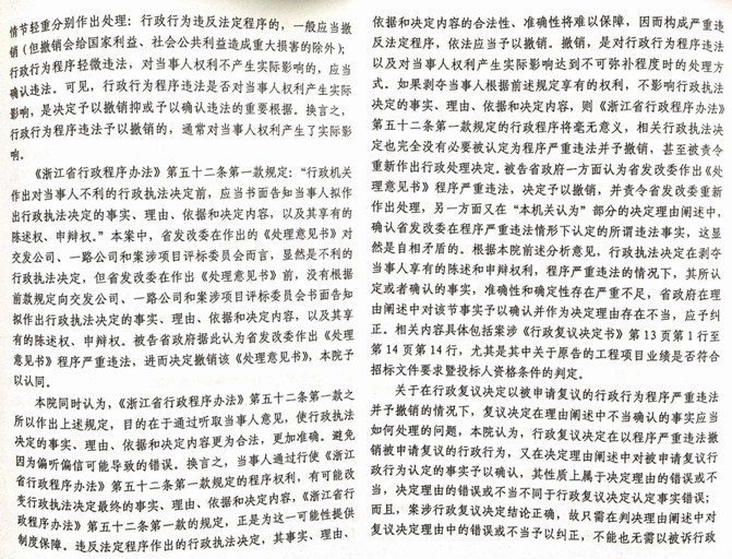 杭州中院同时认为,被告省政府一方面认为省发改委做出《处理意见书》程序严重违法,决定予以撤销,并责令省发改委重新做出处理,另一方面又在“本机关认为"部分的决定理由阐述中,确认省发改委在程序严重违法情形下认定的所谓违法事实,这显然是自相矛盾的。根据本院前述分析意见,行政执法决定在剥夺当事人享有的陈述和申辩权利,程序严重违法的情况下,其所认定或者确认的事实,准确性和确定性存在严重不足,省政府在理由阐述中对该节事实予以确认并作为决定理由存在不当,应予纠正,相关内容具体包括案涉《行政复议决定书》第13页第1行至第14页第14行,尤其是其中关于原告的工程项目业绩是否符合招标文件要求暨投标人资格条件的判定。