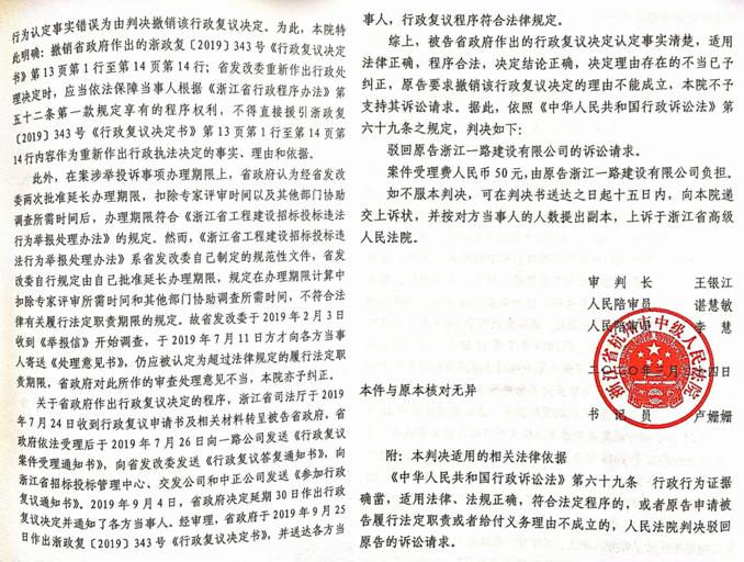 对此,一路公司不服,认为在省发改委程序严重违法的情况下,其违法做出的业绩无效认定是错误的,省政府的复议决定不仅没有纠正该错误反而认为其认定事实清楚,证据充分,2019年10月23日,向杭州市中级人民法院提起诉讼。