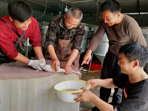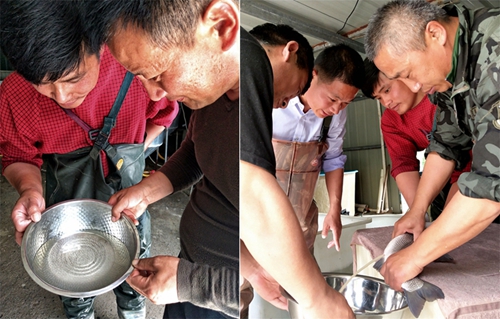 每年五月份是繁殖鱼苗的季节,从催产、排卵、孵化等一系列步骤都丝毫不敢马虎,24小时必须有人守护。倪长征边指导工人操作边毫无保留地说出了孵化养殖的具体操作步骤。首先基础设施具备,做好好水循环和23度水温。然后挑选壮年亲鱼放入网箱里逐个注射催产素,再放入孵化车间进行流水刺激。第二天就可进行人工催产,将产出来的鱼卵进行受精,再放在孵化桶里进行孵化。5天后就会出来鱼苗水花,再饲养20天即可长成两厘米长的小鱼苗进行出售。整个过程只要掌握好时间,把握好水温等技术要领,鱼苗孵化率可达到90%以上。