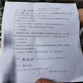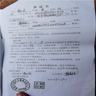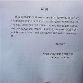 据韩春艳向记者透露,她是2018年5月19日经朋友介绍来到黑龙江财道汽车销售有限公司来参加一个汽车销售会,当时接待她的人叫吴晓玲,是财道公司的一名员工,她现在认为吴晓玲也是公司成员之一。韩春艳告诉记者,当时公司承诺我的利益是很高的,而且公司有营业执照,法人代表也弄的气势很隆重的样子,当时吴晓玲推荐我认识公司一个叫杨大庆的人,说是经理。之后杨大庆就跟我推荐公司的各种优惠政策,又介绍了他的个人简历,而且承诺,公司如果不盈利,所有的损失都由他个人为我承担,就这样,我相信了他们的谎言,先后投资28万元。第一次投资6万元,第二次投资22万元,都转账给杨大庆个人了,到今天为止没挣到公司一分钱,所以我要求杨大庆赔偿我的个人损失,共计28万元人民币+利息,但至今无人承担此事,我认为公司和杨大庆属欺诈行为。韩春艳并向记者出示了公司提供的证据的证明材料,以及她本人给杨大庆的转账信息,还有她和杨大庆的协议书。