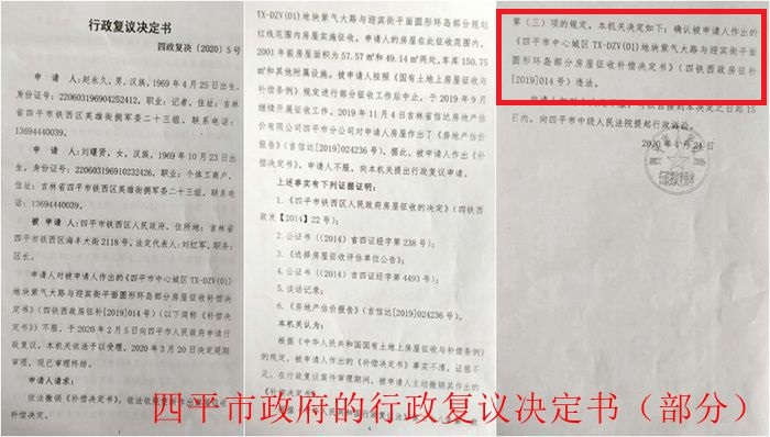2019年,铁西政府又开始第二轮征收,并下发征收补偿决定书。这时候,此地所有商户和住户均不服,并向四平市自然资源局申请政府信息公开,回复为没有此地块为公共利益用地的正式批准文件。2019年11月4日,吉林省信达房地产估价有限公司四平市分公司对赵永久房屋作出了《房地产估价报告》(吉信达[2019]024236号),据此,铁西区政府作岀《补偿决定书》,赵永久不服,提出行政复议申请。2020年4月21日,四平市政府做出四政复决(2020)5号行政复议决定书称:四平市铁西区人民政府下发的补偿决定书事实不清,证据不足,确认此行为违法。