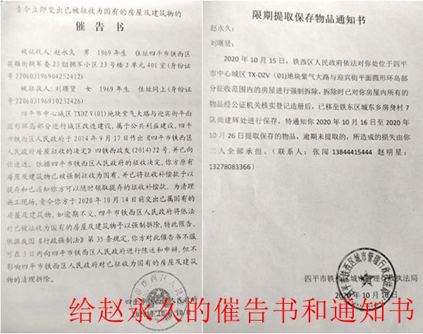 赵永久对记者说:在房屋征收补偿决定书没有发生法律效力的情况下,铁西区政府又于2020年9月4日向铁西区法院提起诉讼,案件名称为“四平铁西区人民政府等申请赵永久等行政非诉案由一案的强拆通知”,随即赵永久向四平中级法院提起诉讼,并在10月9日接到四平中级法院于10月16日上午9时开庭审理此案的传票。就在即将开庭之时,铁西政府又违法给赵永久下达了责令立即交出已被征收为国有的房屋及建筑物的催告书,并在催告书中告知要在10月14日,也就是要在四平中级法院开庭审理此案的前两天强拆。赵永久认为,起诉期内,铁西区政府在没有法院审理裁定可以强拆的情况下,无权进行强拆。但是,铁西区政府却在10月15日,就对赵的房屋进行了强行拆除!