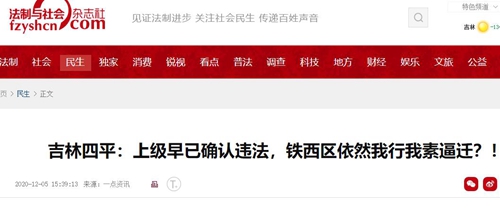 本站讯 公开资料显示,早在2020年4月21日,吉林省四平市政府就做出行政复议,认定该市铁西区政府下发的补偿决定书事实不清,证据不足,确认《四平市中心城区TX-DZV(01)地块紫气大路与迎宾街平面圆形环岛部分房屋征收补偿决定书》违法。然而,多名商户和住户反映:时至今日,铁西区政府一点都没有收手的意思,依然在变本加厉的对商户住户进行逼迁。10月15日,就在四平市中级法院开庭审理赵永久起诉铁西区政府要求其撤销行政行为一案的前一天,铁西区政府将赵的房屋强行拆除!与此同时,一些商户被持续断水断气断电,还有一些商户、住户的单元门和窗户被开发商用土堆堵死,正在经营的商户临街的门面也被用铁皮围栏围上......一时间,舆论哗然,人们不禁要问:为什么又是铁西区?为什么又是强拆?五年前发生在铁西区的芦志刚案还不足以让铁西区政府警醒吗?难道铁西区非得再制造一个甚至多个芦永刚强拆案吗?难道铁西区政府敢于和上级政府对着干吗?难道四平市政府管不了铁西区吗?难道市政府的复议决定连放屁都不如吗......