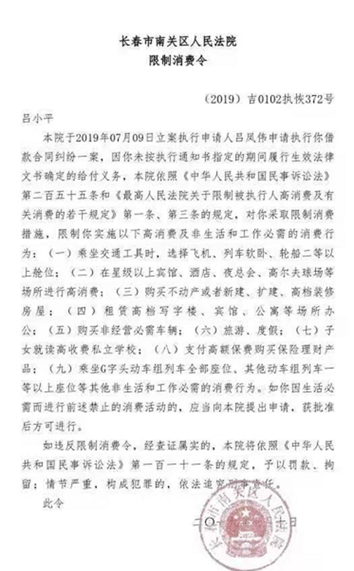 2019年 10月10日,南关区法院向吕小平做出《限制消费令》。