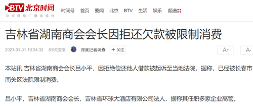 本站讯 吉林省湖南商会会长吕小平,因拒绝偿还他人借款被起诉至当地法院,据称,已经被长春市南关区法院限制消费。