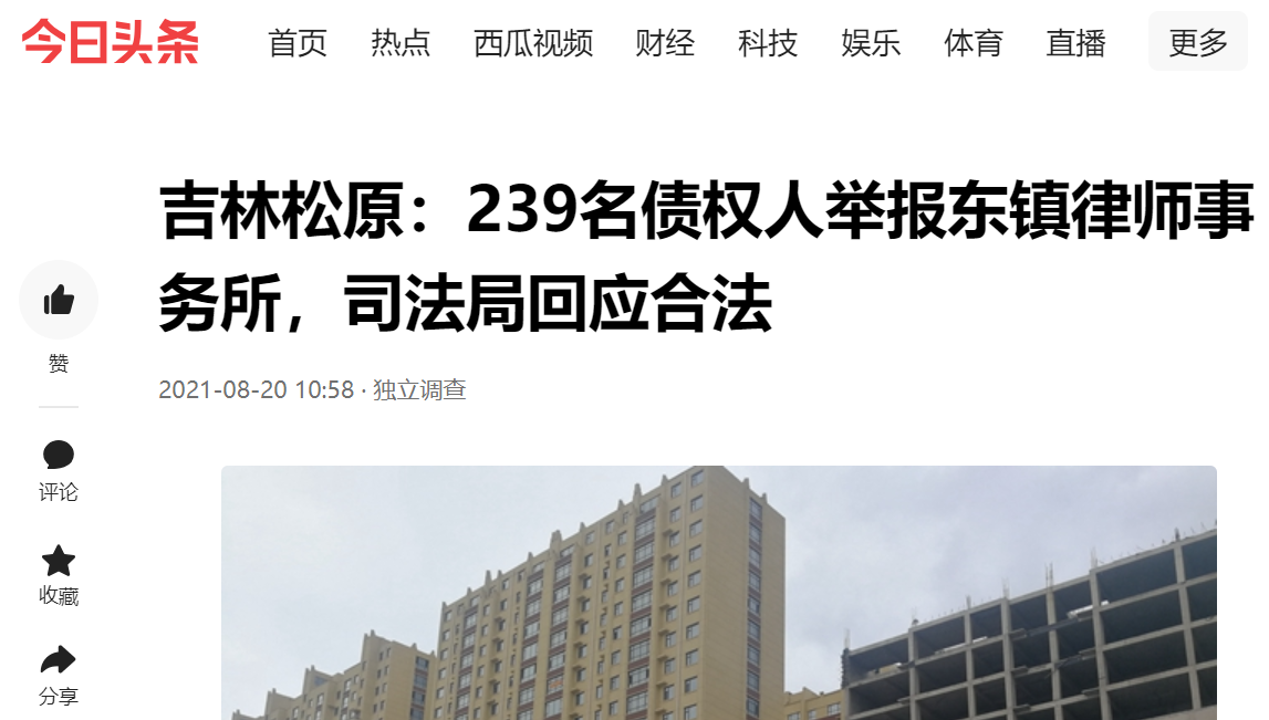 本站讯 2021年8月10日,吉林省松原市发生了一件令人感到震惊的事情:239名债权人将状告吉林东镇律师事务所(以下简称东镇律所)的举报材料送交至松原市司法局和吉林省司法厅,这些债权人认为:在办理松原程亿房地产开发有限公司(以下简称程亿公司)破产重整案件过程中,东镇律所作为破产管理人涉嫌违法、违规,致使众多债权人的利益严重受损。