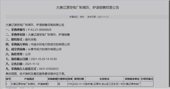 2021年10月,大唐辽源发电厂以公开询价方式就“大唐辽源发电厂粉煤灰、炉渣销售”项目发布销售采购公告,采购项目概况为:“大唐辽源发电厂2021年11月16日至2022年11月15日期间,计划产出粉煤灰及炉渣约40万吨(其中:粉煤灰约34万吨、炉渣约6万吨),供货方每月按实际生产量,委托中标方进行粉煤灰及炉渣销售工作。期间由中标方负责按照国家环保法律法规及地方环保部门的要求,开展粉煤灰及炉渣的外运、存储、生产、经营等工作。”