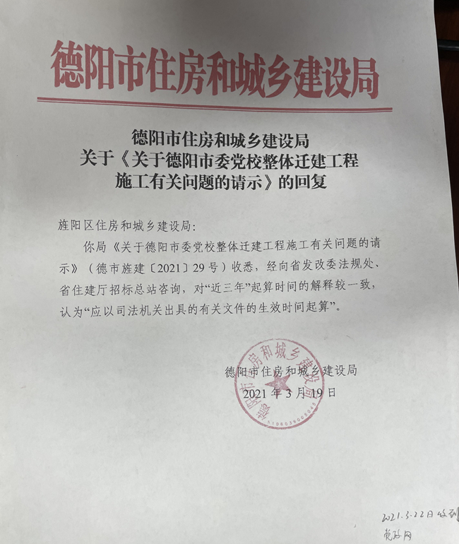 2022年1月5日,记者一行经过多方的努力,经过市委宣传部的协调,终于见到德阳市住建局办公室张主任,当记者说明来意,把盖有德阳市住建局印章对旌阳区住建局的答复给张主任甄别时,记者问张主任:“这个文件怎么没有文号?”,张主任答:“这个事情我不知道,办公室没有存档。”于是,张主任联系了德阳市招标站原负责人,该负责人答:“已退休,不知道这个事情”。张主任又给市招标站孙站长联系,孙站长到办公室解释说:“这是德阳市住建局的章,这个事情我知道,但具体操作是王副站长经办的,他现在在外面办事,只有另找时间向王副站长核实”。
