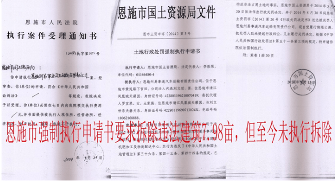 上图为恩施市人民法院执行受理通知书,至今未拆除。