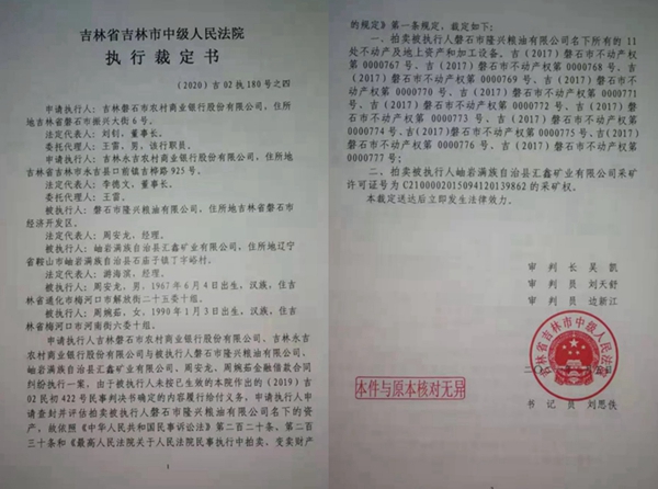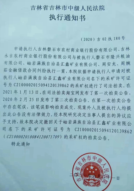 谁知,股权转让完成后,一系列的问题就来了。2019年底,游海滨接到吉林市中级法院的开庭传票,吉林磐石农村商业银行股份有限公司和吉林永吉农村商业银行股份有限公司向法院起诉由周安龙担任法定代表人的磐石市隆兴粮油有限公司借款合同纠纷,因汇鑫矿业于2017年8月31日在周婉茹担任法定代表人期间,为磐石市隆兴粮油有限公司贷款5000万元额度提供了担保(也就是女儿公司为父亲公司担保),最终吉林市中级法院作出(2019)吉02民初422号判决,判令汇鑫矿业对周安龙的磐石市隆兴粮油有限公司贷款49999975.7万元承担连带责任,给汇鑫矿业及游海滨造成了严重后果。目前,吉林市中级法院的(2019)吉02民初422号判决已经生效,汇鑫矿业的采矿权已经被查封了,法院正在执行中。