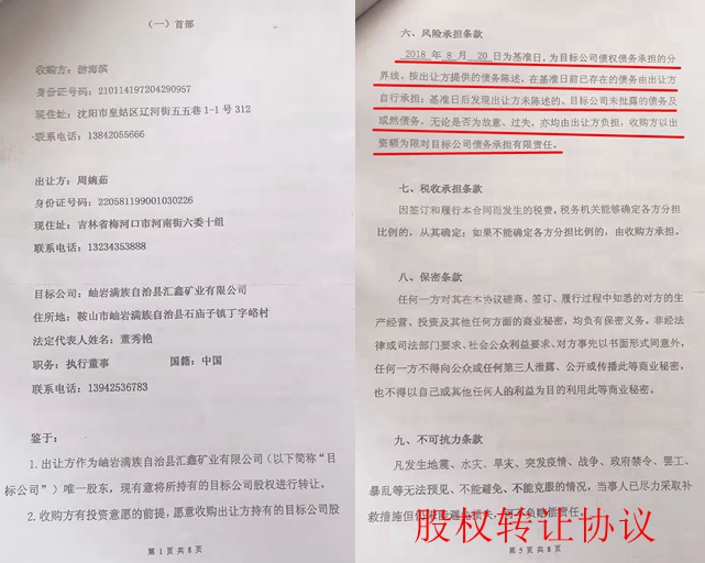 据神州网报道:2018年,周安龙欲将汇鑫矿业的全部股份转让给游海滨,并明确告诉游海滨,汇鑫矿业只欠董秀艳600万元,无其他任何外债。2018年8月20日,周安龙、周婉茹与游海滨签定《股权转让协议》,将汇鑫矿业的股权转让给了游海滨,转让金为4500万元。