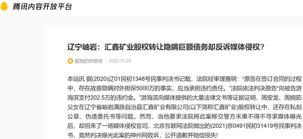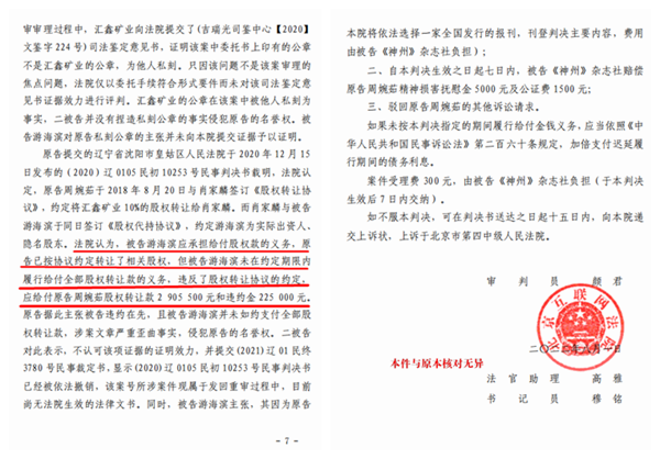 本站讯 据(2020)辽01民初1348号民事判决书记载,法院经审理查明:“原告在签订合同的过程中,存在故意隐瞒对外担保5000万的事实,应当承担违约责任。”法院依法判决原告“向被告游海滨支付202.5万的违约金。”游海滨向媒体提供的大量法律文书等证据证明,周安龙、周婉茹父女在辽宁省岫岩满族自治县汇鑫矿业有限公司(以下简称汇鑫矿业)股权转让中,还存在私刻公章、伪造委托书等问题。然而,当他要求法院将此案移交警方未果不得不寻求媒体曝光后,却招来了一场媒体侵权官司,北京互联网法院做出的(2021)京0491民初31419号民事判决书,竟然判决曝光此案的神州网败诉,公开道歉并赔偿损失!