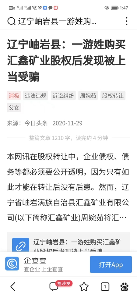 神州网题为《辽宁岫岩县:一游姓购买汇鑫矿业股权后发现被上当受骗》的报道发出后,周婉茹认为该报道侵害了他们的名誉权,遂起诉《神州》杂志社和游海滨网络侵权。北京互联网法院于2022年8月1日作出(2021)京0491民初31419号民事判决书,判决《神州》杂志社败诉。该判决书称:本院认为,关于原告是否在与被告游海滨签订股权转让协议时故意隐瞒事实、骗取股权转让款,上述(2020)辽01民初1348号案件和(2020)辽0105民初10253号案件系关联案件。(2020)辽01民初1348号民事判决书已生效,法院认定,原告在签订合同的过程中,存在故意隐瞒对外担保5000万的事实。(2020)辽0105民初10253号民事判决书未审查汇鑫矿业是否存在对外担保、债务以及在转让案涉股权过程中原告和被告游海滨双方的实际交易情况等案件事实,被(2021)辽民终3780号民事裁定书依法撤销,发回重审,该案仍在审理中,并无生效判决。因此本院认为,原告是否在与被告游海滨签订股权转让协议时故意隐瞞事实、骗取股权转让款的事实尚有争议。