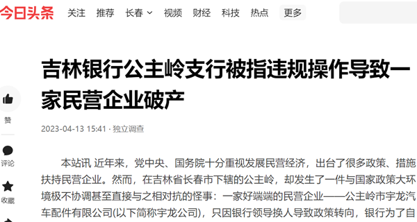 本站讯 近年来,党中央、国务院十分重视发展民营经济,出台了很多政策、措施扶持民营企业。然而,在吉林省长春市下辖的公主岭,却发生了一件与国家政策大环境极不协调甚至直接与之相对抗的怪事:一家好端端的民营企业——公主岭市宇龙汽车配件有限公司(以下简称宇龙公司),只因银行领导换人导致政策转向,银行为了自身利益被指违规操作,导致企业破产!2023年3月末的一天,当宇龙公司负责人徐凤明向媒体诉说本企业遭遇时,不禁令人唏嘘不已。