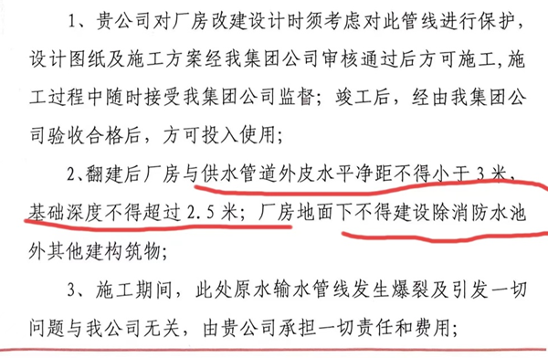 采访中记者了解到,大连水务局对金普新区自然资源局的此举很是不满,只因为,这企业就在五年前申请技术改造改建厂房时,第一时间就找到水务局,水务局告知此事要找大连市自来水集团办理,而后大连市自来水集团要求他们在技改改建厂房时,对地下管道要有一定的环保防护设施,同时要有规定距离,并下了文件,有了这个文件,这企业才开始跑自然资源局,这一跑就是五年。