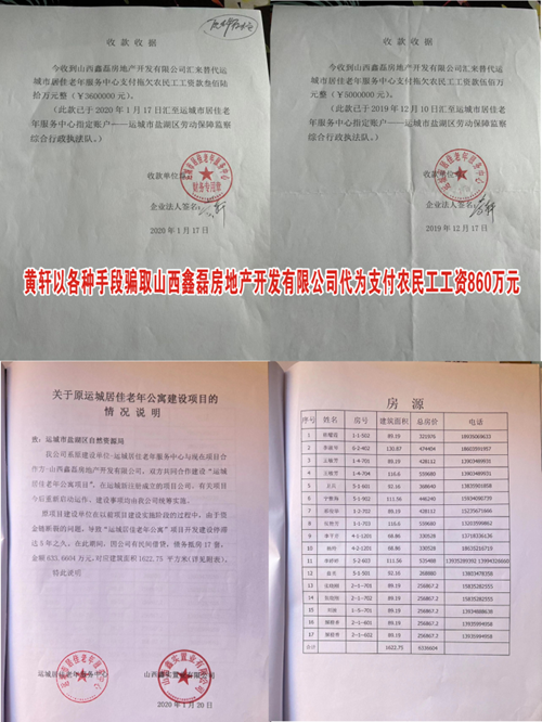但时至今日,相关部门无实质性处置方案以解决拖欠部分农民工工资和所欠工程款。而开发商黄轩四方八面坑蒙拐骗, 农民工资是开发商黄轩从山西鑫磊骗取捌佰陆拾万元支付的,只是支付了部分农民工工资,他还危言耸听,以下收据为证。