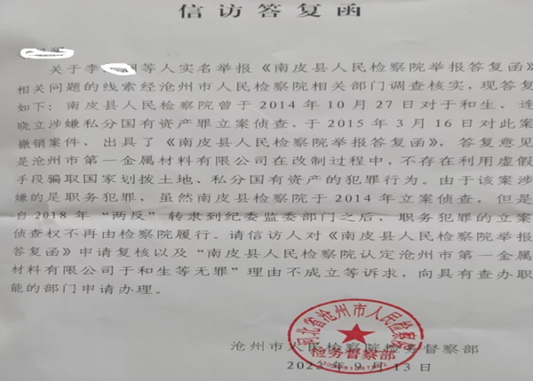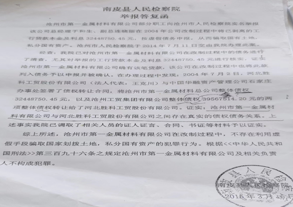 面对众举报人不断的质疑声,南皮县检察院于2015年3月16日,给举报人出具了一份答复函。答复函中说,改制后的一金属,与河北胜科工贸之间存在真实的债权债务关系(检察院认为一金属欠河北工贸3244万多元),因而一金属不存在私分国有资产、骗取国有土地的犯罪行为。