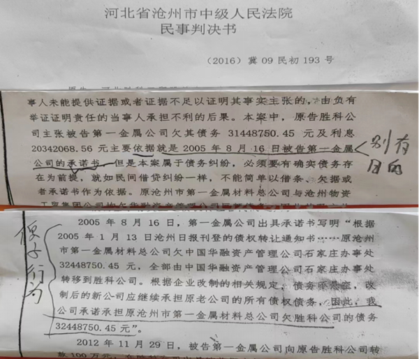 2015年,所谓“债权方”河北胜科工贸向沧州市中级法院状告一金属,向其索要欠款本息共计5100万多元。庭审中,一金属不承认有此笔欠款。沧州中院经庭审,证明此笔欠款根本就不存在——至此,南皮检察院曾认定有关人员无罪的证据荡然无存了!——苍天有眼!有“河北省沧州市中级法院(2016)冀(09)民初193号”判决书和之后的终审判决书为证!