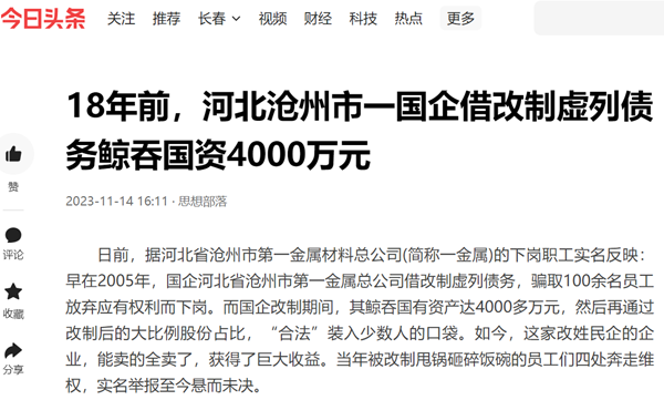日前,据河北省沧州市第一金属材料总公司(简称一金属)的下岗职工实名反映:早在2005年,国企河北省沧州市第一金属总公司借改制虚列债务,骗取100余名员工放弃应有权利而下岗。而国企改制期间,其鲸吞国有资产达4000多万元,然后再通过改制后的大比例股份占比,“合法”装入少数人的口袋。如今,这家改姓民企的企业,能卖的全卖了,获得了巨大收益。当年被改制甩锅砸碎饭碗的员工们四处奔走维权,实名举报至今悬而未决。