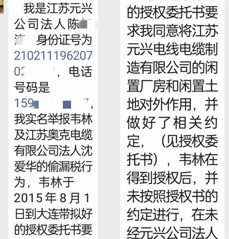 被举报者名叫韦林,是江苏盐城东台市人,他在东台市时堰镇三时村的工业园区有家电缆企业,名为“江苏奥克”,后被大连一家电缆企业收购,更名为“江苏元兴电线电缆制造有限公司”,新的公司大连企业占股70%,原企业法人韦林占股30%。