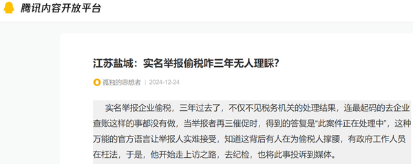 实名举报企业偷税,三年过去了,不仅不见税务机关的处理结果,连最起码的去企业查账这样的事都没有做,当举报者再三催促时,得到的答复是“此案件正在处理中”,这种万能的官方语言让举报人实难接受,知道这背后有人在为偷税人撑腰,有政府工作人员在枉法,于是,他开始走上访之路,去纪检,也将此事投诉到媒体。