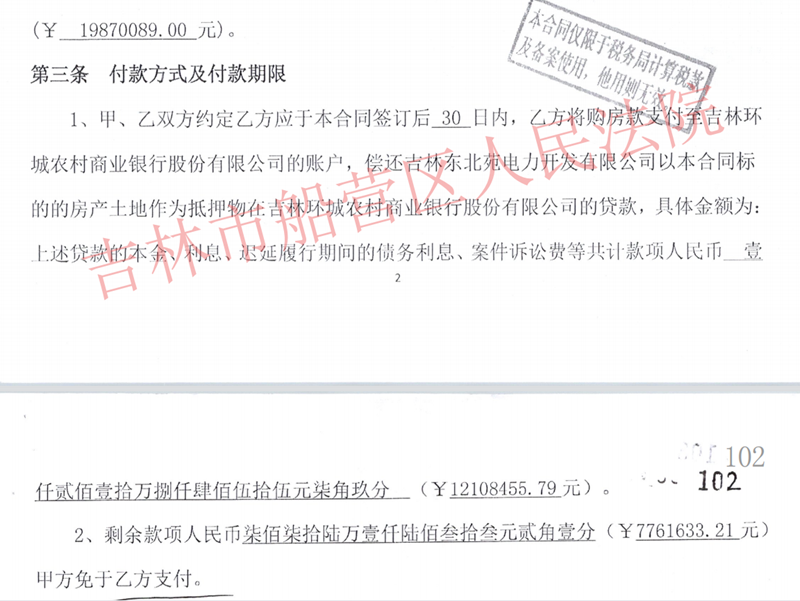 法院另查明,2021年2月3日九洲公司(甲方)与德洋公司(乙方)另签一份《房屋及土地买卖合同》(以下简称:合同2),该合同中除第二条:土地总价款为19870089元,第三条合同签订后30日内乙方支付环城商业银行偿还东北苑电力贷款具体金额为12108455.79元,剩余款项人民币7761633.21元,乙方于2022年12月31日之前支付完毕。